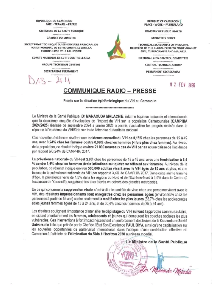 The Minister of Public Health, Dr. Manaouda Malachie, in a press release on February 2, 2026 unveiled significant findings from the recent HIV epidemiological study, CAMPHIA 2024/2025. This comprehensive survey, conducted from September 2024 to January 2025, sheds light on the current state of HIV/AIDS in the country, highlighting both progress and ongoing challenges in the fight against this epidemic.