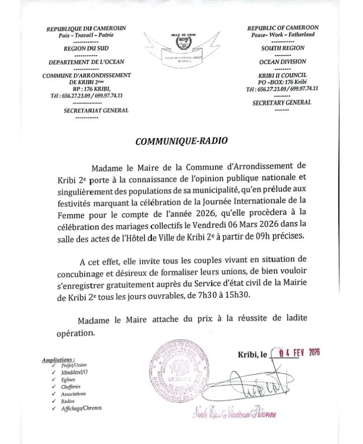 As International Women’s Day approaches, the Mayor of Kribi 2 municipality has announced an initiative aimed at strengthening community bonds. On Friday, March 6, 2026, the council chamber of the Kribi 2nd District Town Hall is expected to host a mass marriage ceremony, an opportunity for couples to formalize their unions. The event will commence at 9:00 a.m., and the public is invited to partake in this memorable occasion.